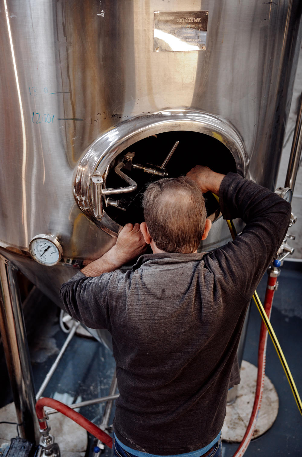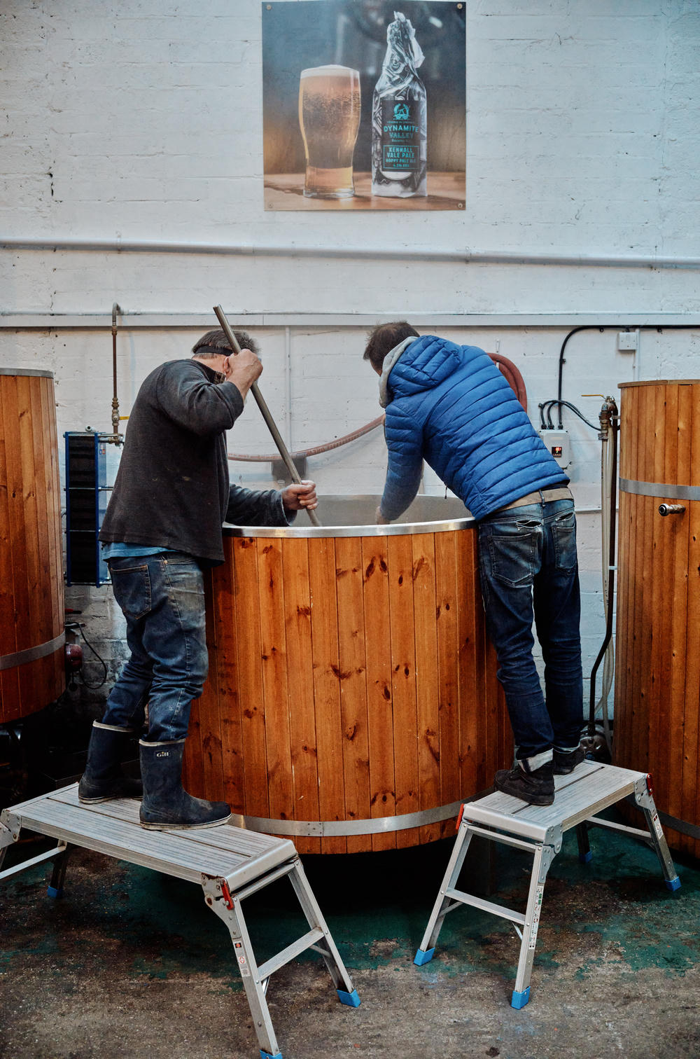 Keith was fairly adamant that the rest of the process isn’t as visually interesting — just “men at work” preparing all the pumps and pipework needed to move their various brews between containers.