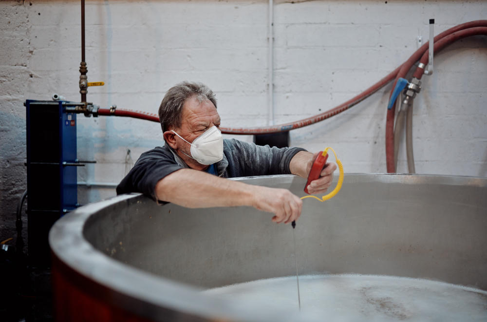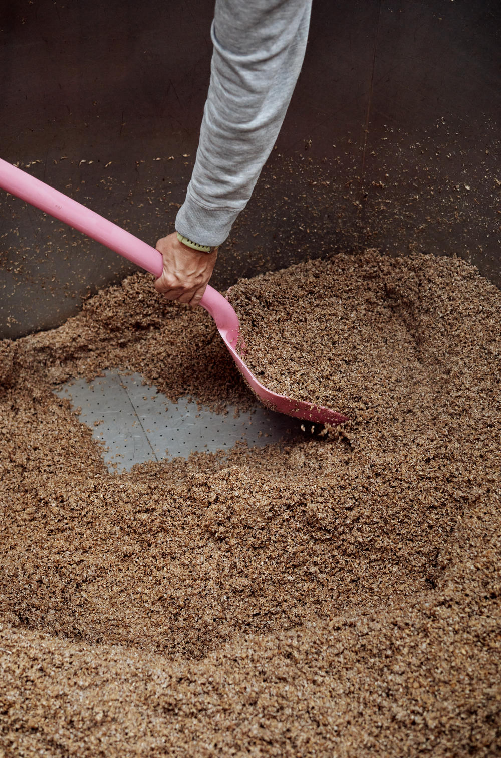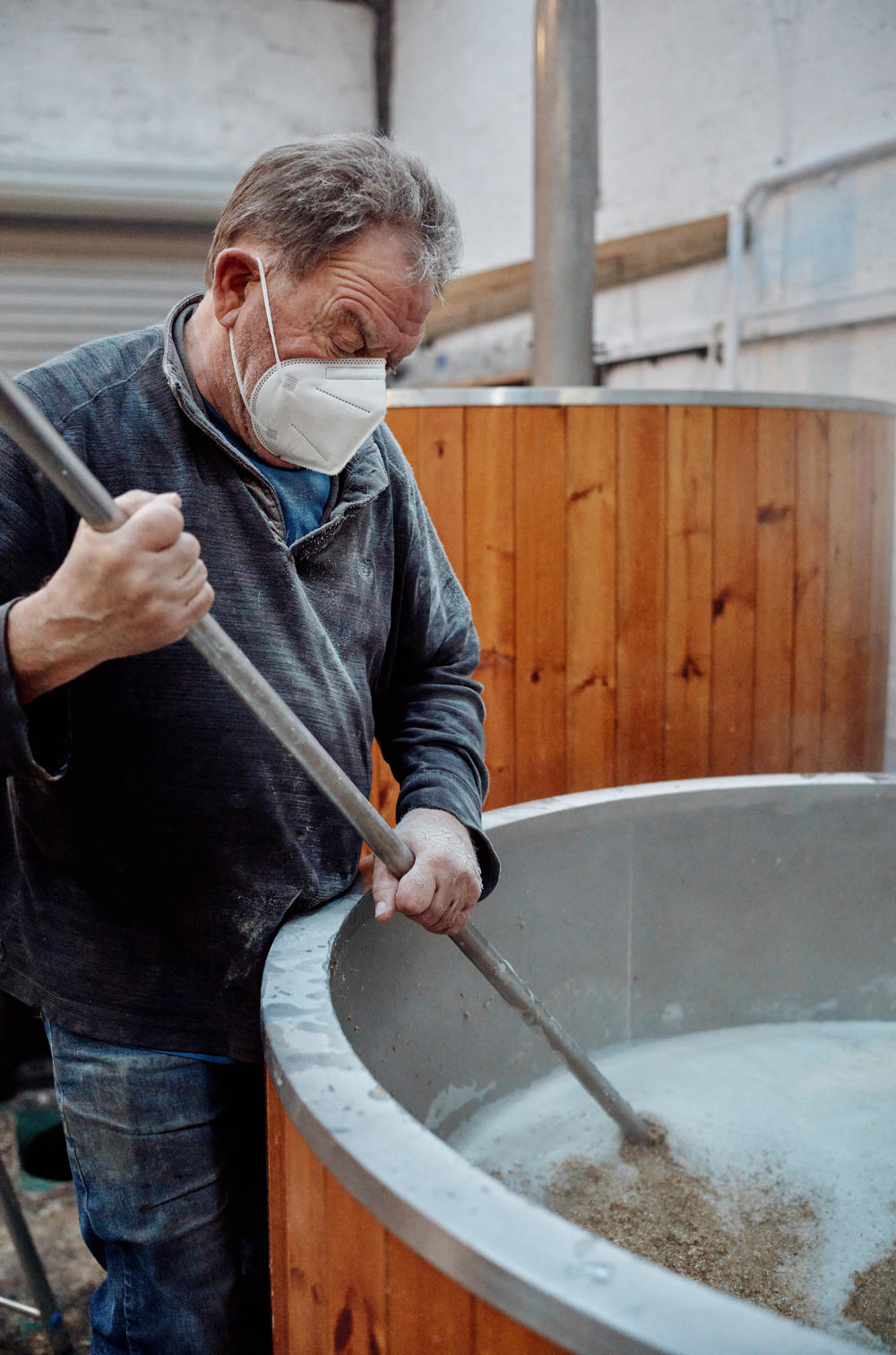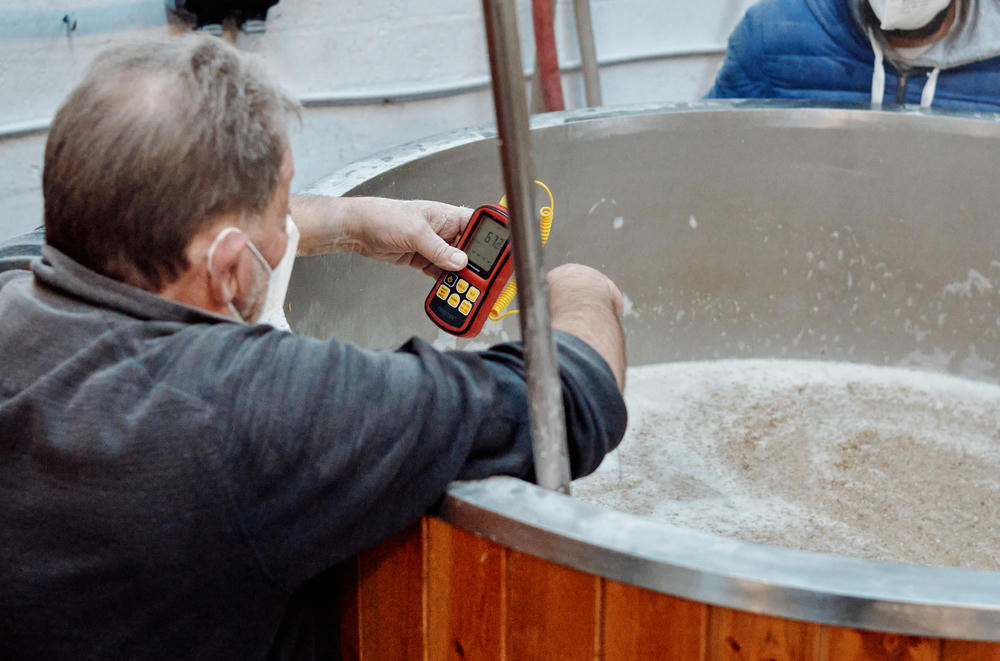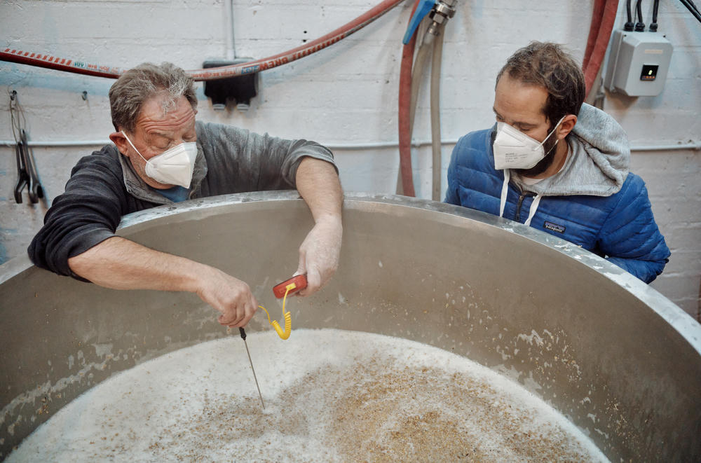 Naively, I wasn’t prepared for the dust created when the grain started being tipped into the hot water. This is a hot, humid and messy process! Despite the countless bags being tipped in, the whole thing happened really quickly. The grain and water are mixed, with regular temperature checks throughout to ensure everything is evenly mixed.