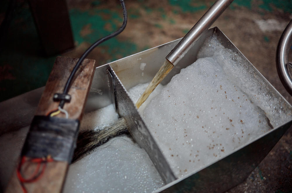 Once the grain and water are fully mixed, they are left for about ninety minutes before a process called “sparging” begins, where 70°C water is washed over the mixture. This takes the mixture through the range of temperatures needed to fully extract all the sugars from the grain. The wort — the now solute-rich liquid — is transferred into the large kettle next to the tun, and Keith checks the gravity of the liquid with a refractomer throughout sparging to ensure that enough sugars and starches are being extracted.