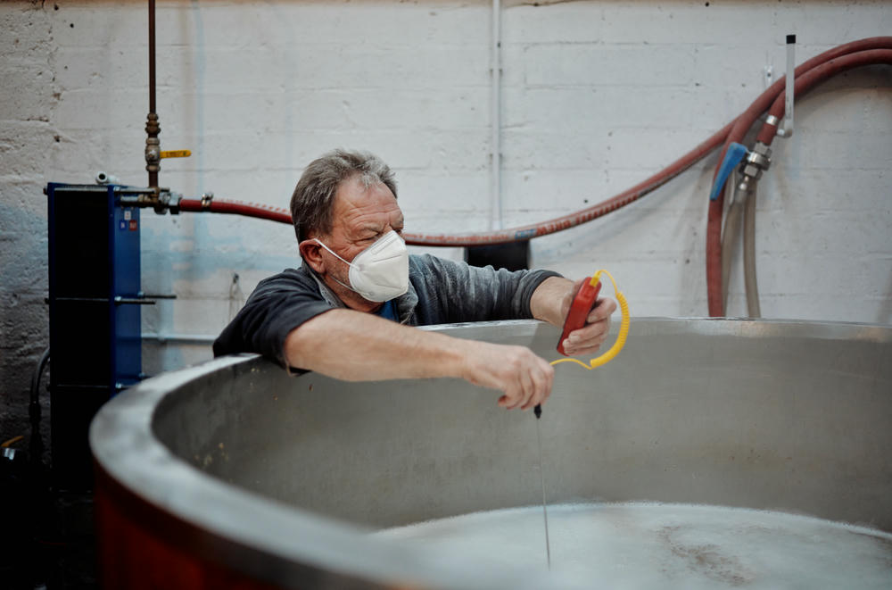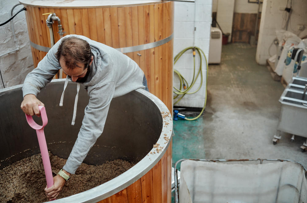 Naively, I wasn’t prepared for the dust created when the grain started being tipped into the hot water. This is a hot, humid and messy process! Despite the countless bags being tipped in, the whole thing happened really quickly. The grain and water are mixed, with regular temperature checks throughout to ensure everything is evenly mixed.