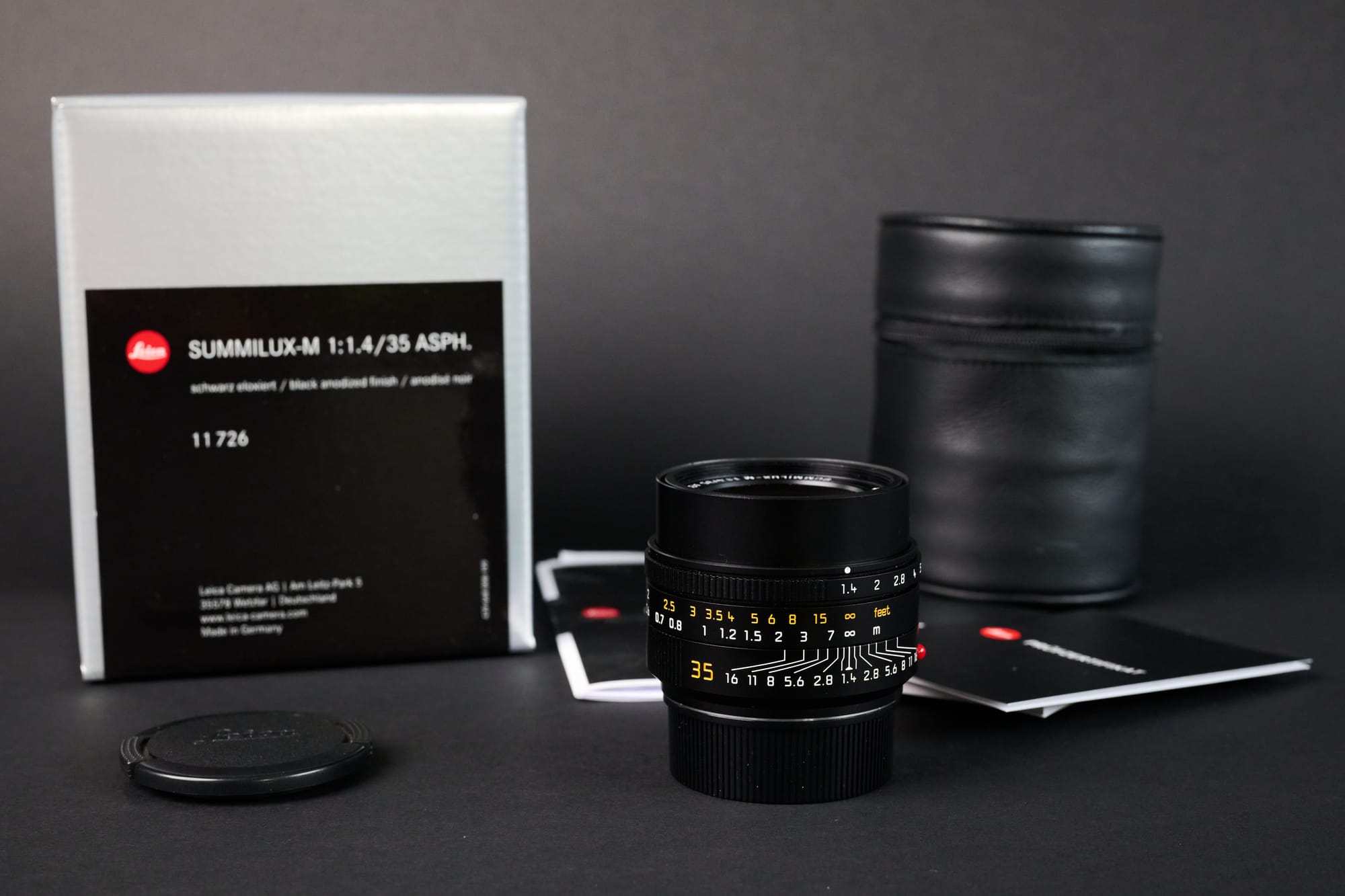 This is the current generation, close-focus FLE. Bought new in September 2022 from Leica Store Manchester, it's in excellent condition with one small bright mark on the edge of the hood. Includes everything as-new, and was recently (Sept. 2025) serviced by Wetzlar to improve the smoothness of focus and aperture adjustments.